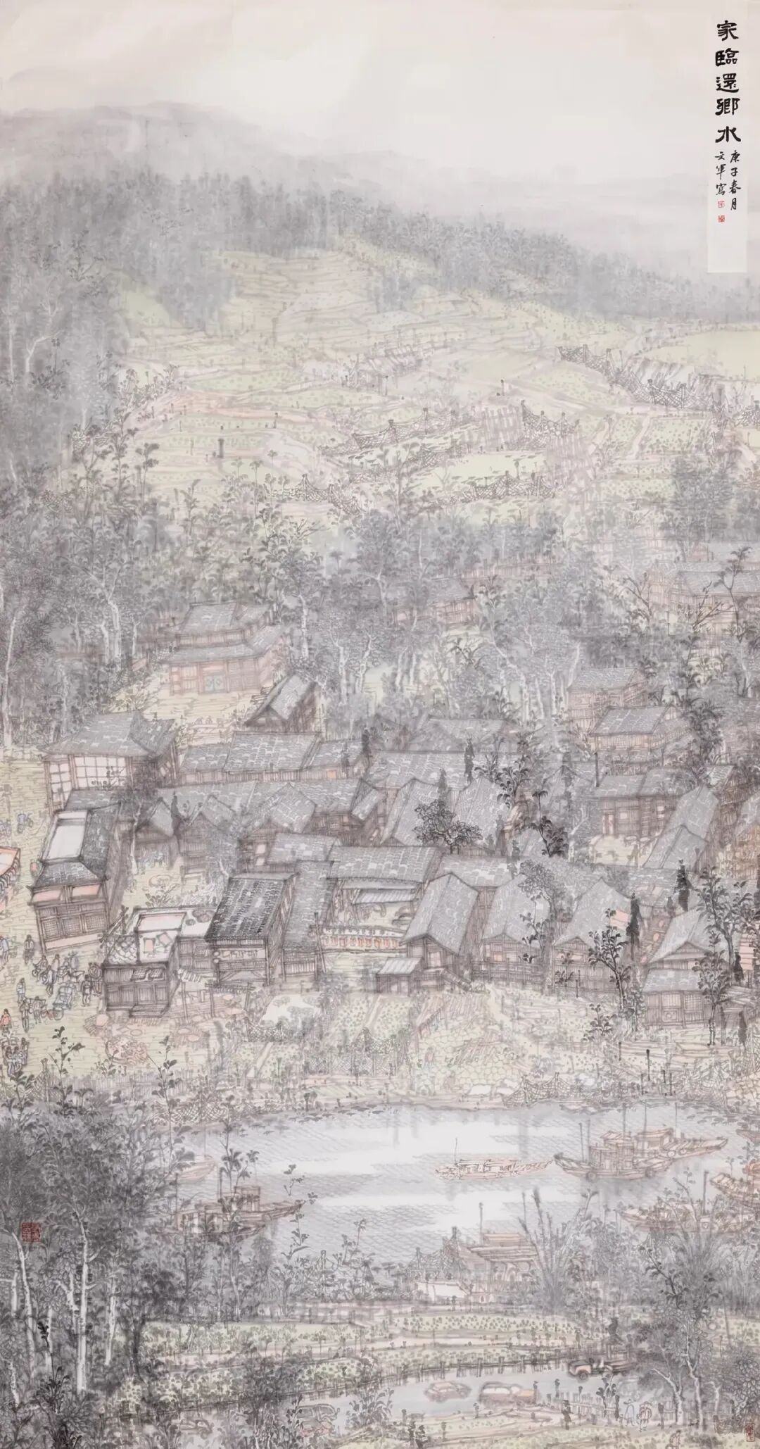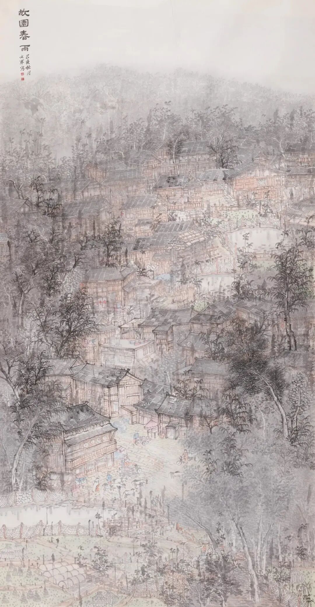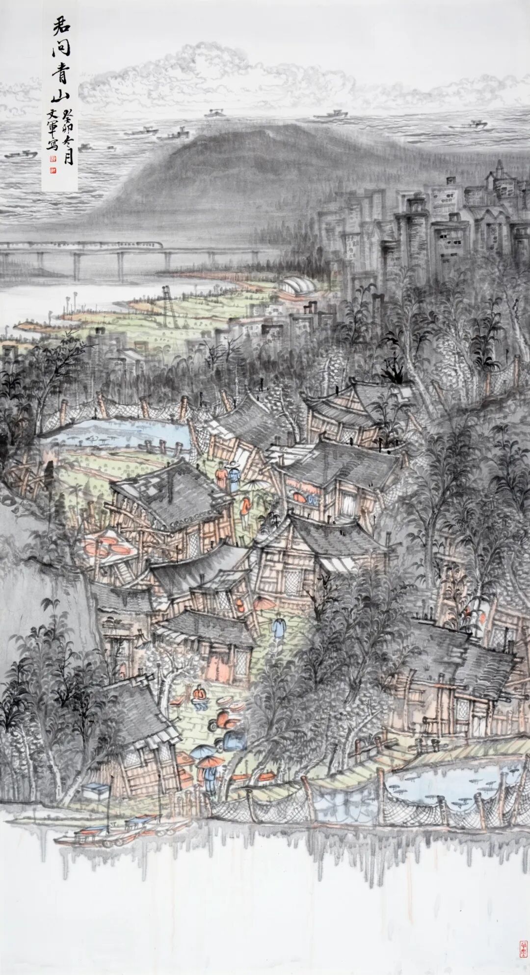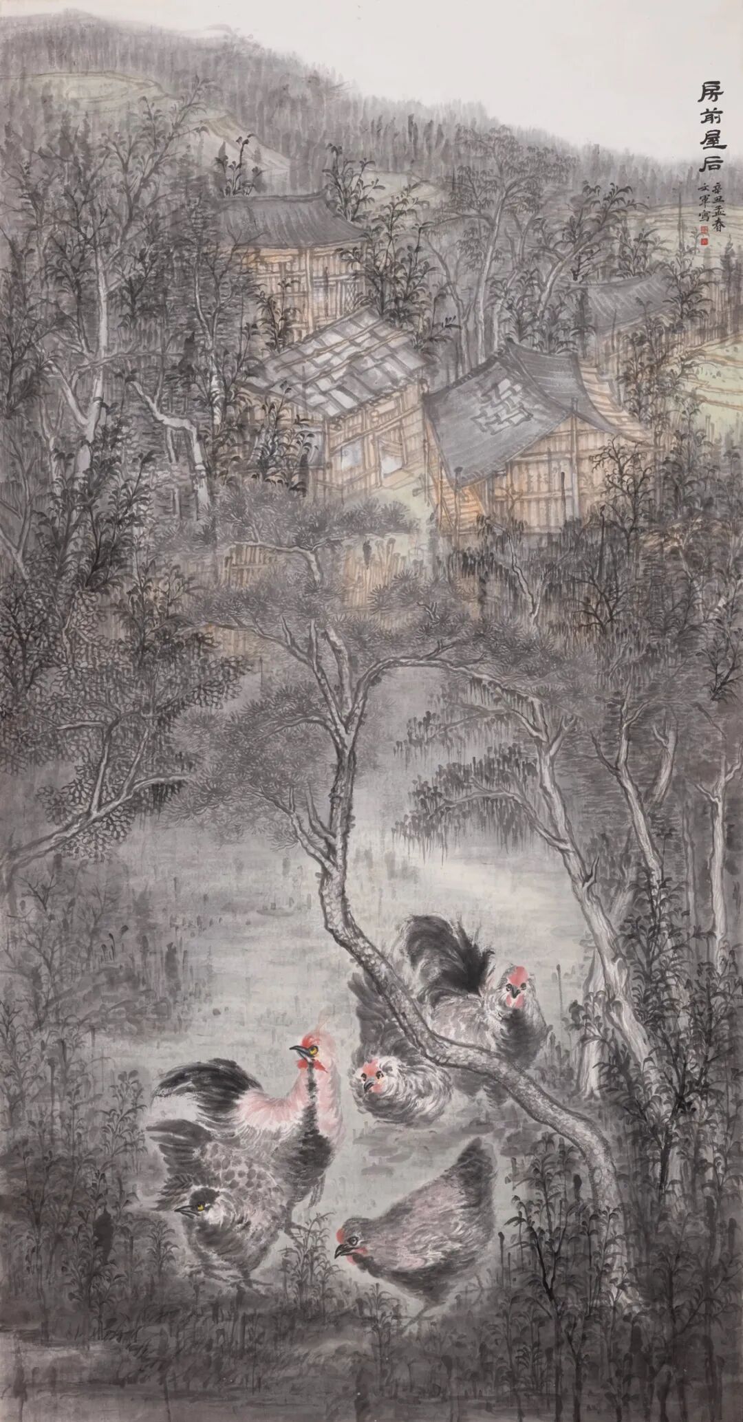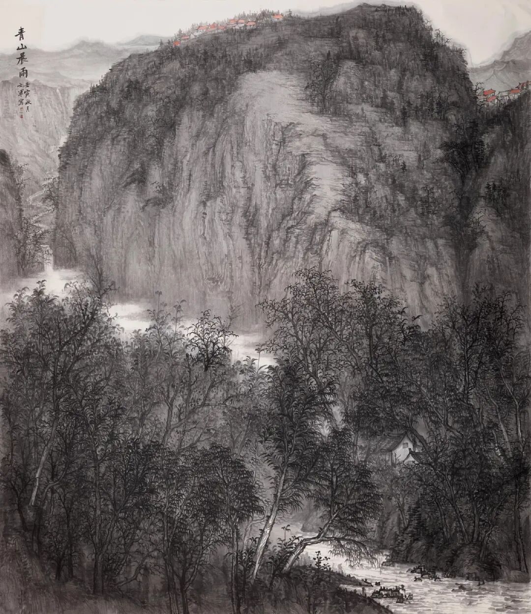 张文军笔下的山水画卷,犹如一篇篇生动的诗章,将自然的幽远与人文的深厚融为一体。山峦巍峨,溪水潺潺,古树参天,田野幽静,这些景象在他的笔下,仿佛带有生命的律动,画家对乡土的眷恋与对自然的敬畏透过纸墨跃然眼前。