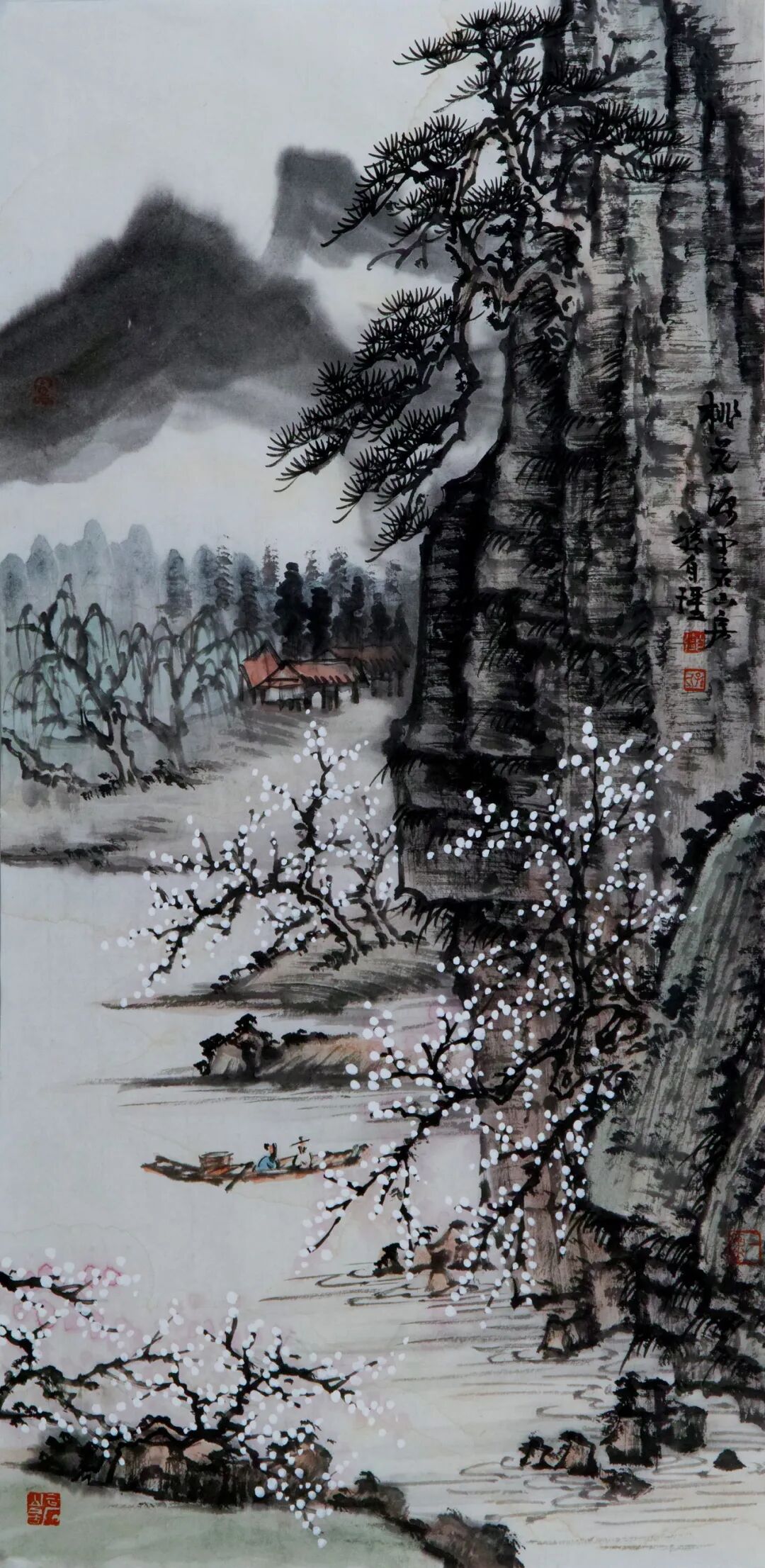 当代艺术家根据桃花源的意象,以诗意的笔墨语言,淡雅的墨色和简练的笔触,勾勒出包含山水、花鸟等自然景物的理想化的隐逸生活场景,营造出一种宁静而和谐的氛围,表达对自然的向往和对世俗生活的超脱。