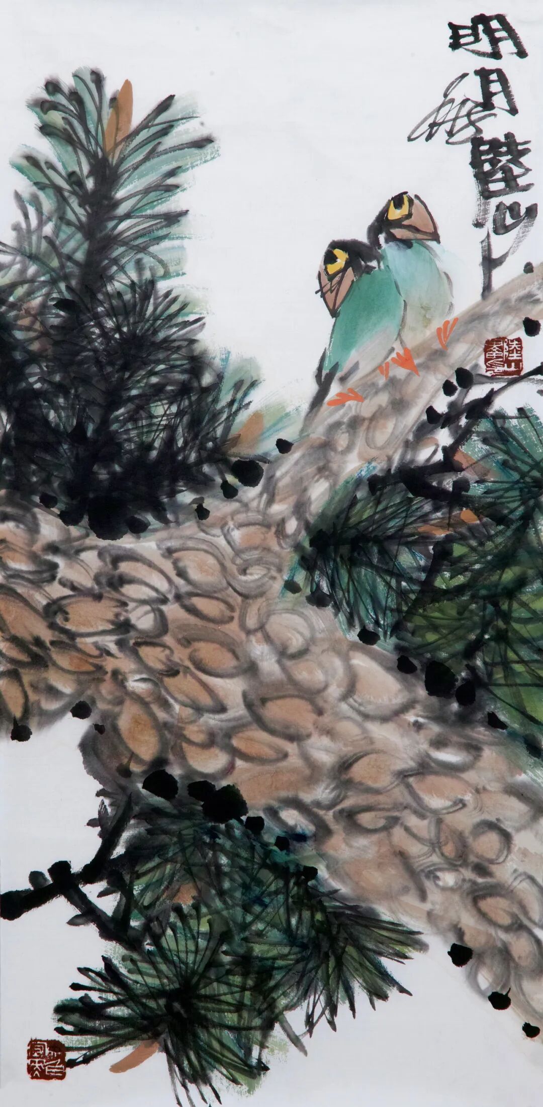 品读画面,这是画家较为成熟的小品花鸟,所谓成熟,是说这种作品笔简而意深,看画面,只有松禽两种,粗壮的松树上伸出一枝树干,其上二禽鸟依偎相伴,有如偕侣,二禽鸟眼神值得玩味,有言辞不能道出之状。