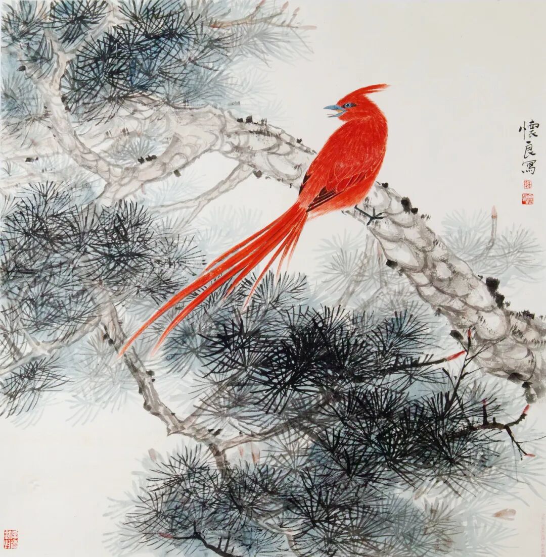 在这幅《青松长寿》中,一棵青松傲立于高峰之巅,其姿态挺拔而不失柔韧,仿佛是大自然中的一位坚韧的守护者,历经风霜雨雪而屹立不倒。松树的枝条繁多而不杂乱,似乎在诉说着岁月的故事,更显其生命力。远方山中树立着红色的丰碑,画作不仅是松树本身的写照,更是画家对长征精神的颂扬。