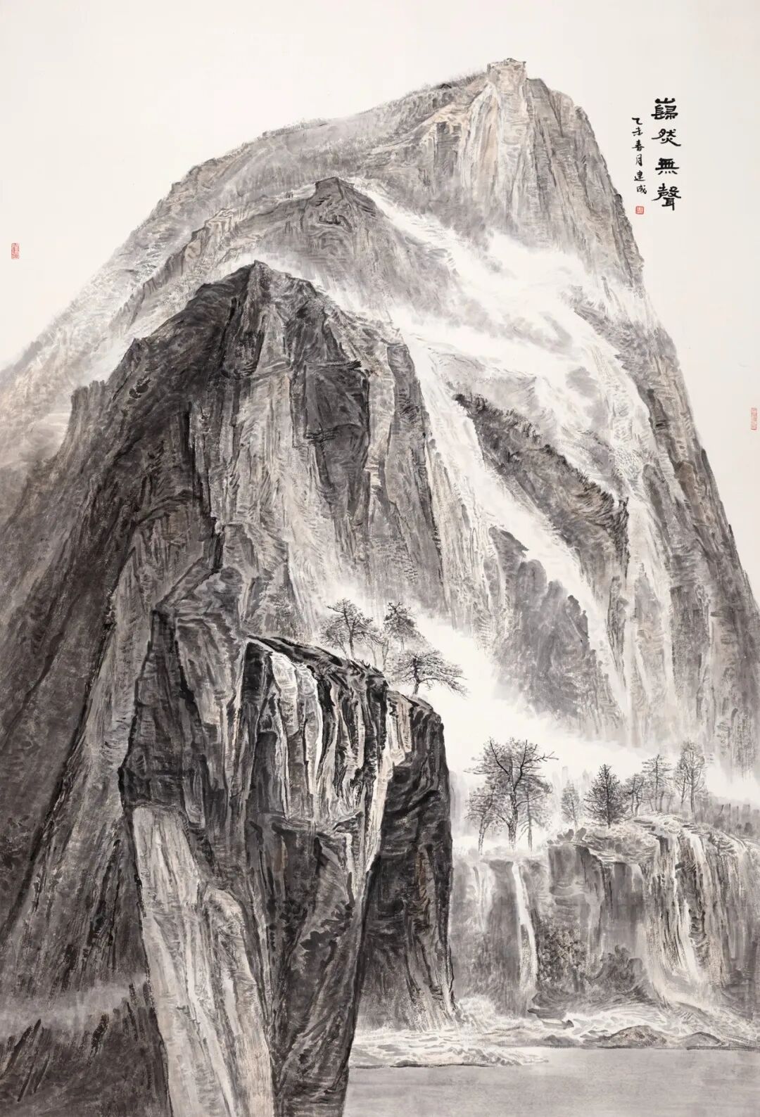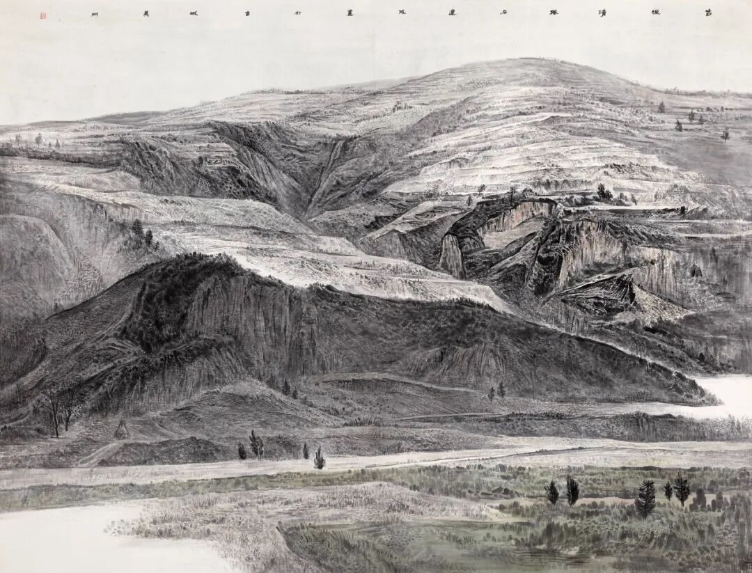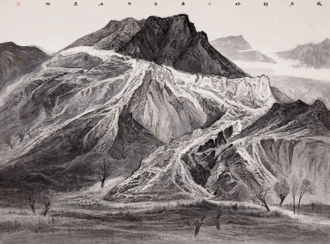 同时,在石建成铿锵有力的传统技法基础上,融合了现代元素和表现手法,他在创作中吸收了西方艺术的理念与表现手法,使得作品更具广阔的视野,强调了艺术家在自然与内心之间的对话,以及通过艺术表达出来的深邃哲思与情感,这种交融不仅丰富了山水画的表现形式,也能更好地反映当代的审美与思想。