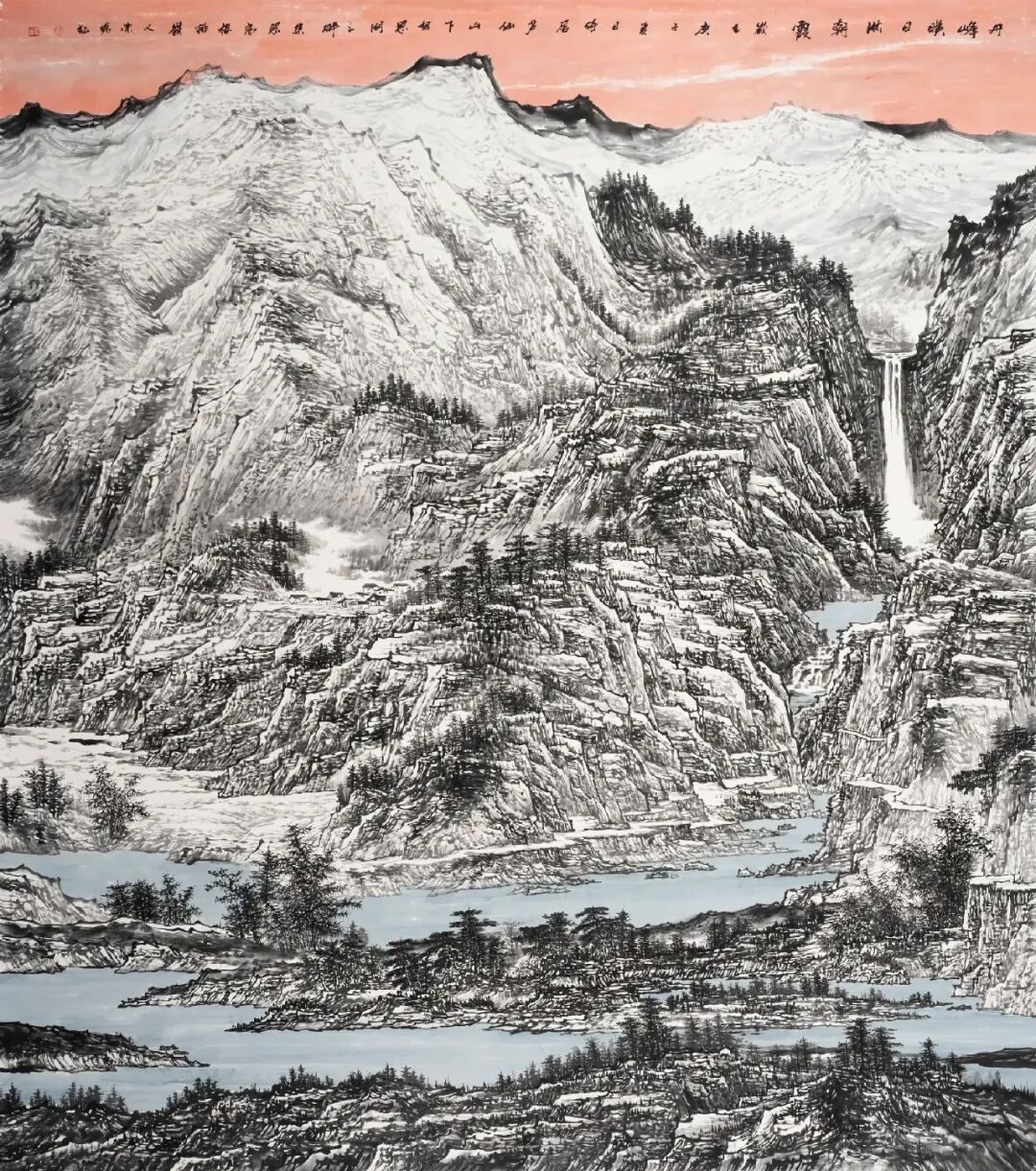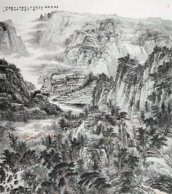 山川巍峨,皴法细腻而多变,墨色浓淡相宜,恰似雄浑的交响乐开篇,磅礴而震撼,每一笔墨色都蕴含着大自然的鬼斧神工。画家以笔锋勾勒山脉轮廓,似在与天地对话,将山川的壮阔与深邃娓娓道来。