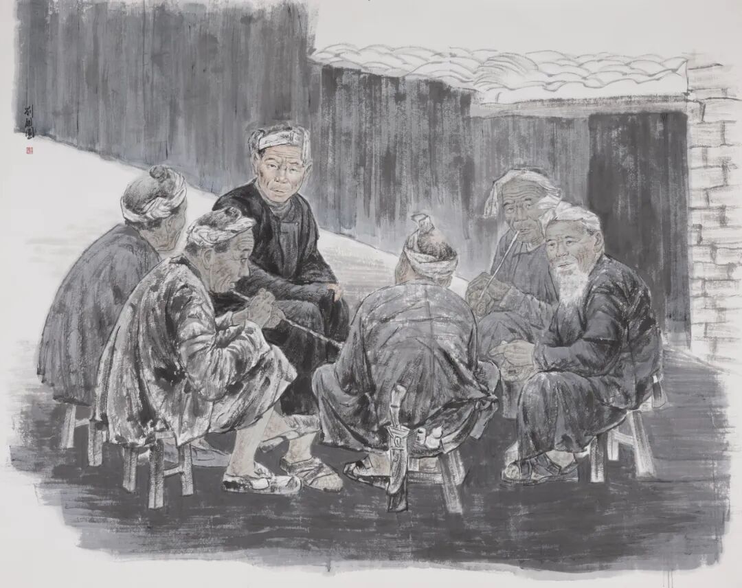 作品《老哥们》捕捉了一群坐在小板凳上谈天说地的老人形象。他们的服饰不仅彰显了地域文化的特色,更凸显了岁月的沉淀与厚重。这群老哥表情各异,有的抽着烟杆,有的认真听讲,这种细腻的描绘,使观众能够感受到他们内心的情感波动和丰富的内心世界。他们沉浸在平凡的生活中,享受着这个没有琐事打扰的闲暇时光。