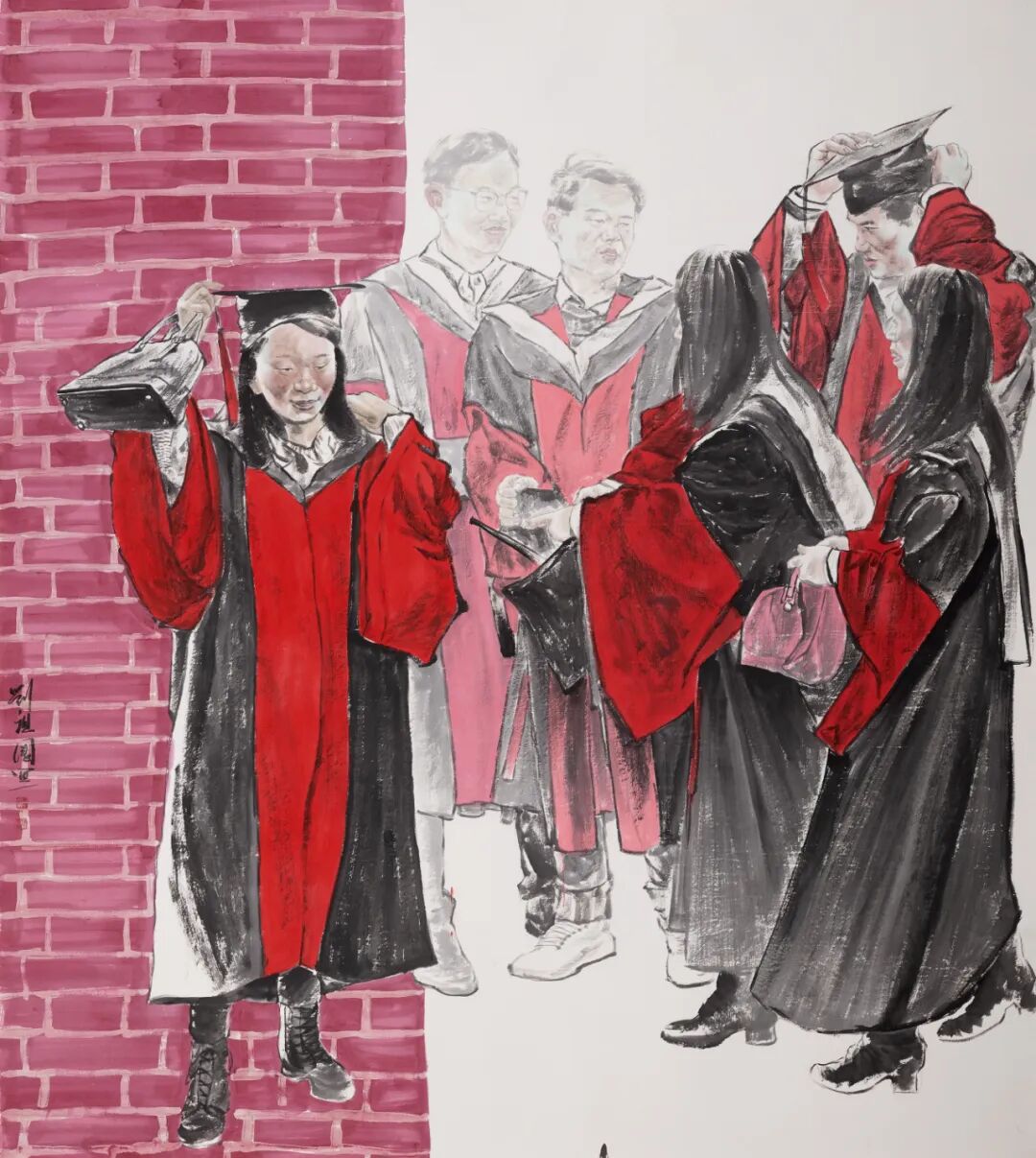 《花样年华》是一幅充满青春与活力的画作,展现了几位身着博士研究生毕业礼袍的年轻人欢聚一堂的喜悦场景。年轻人各具姿态,右边的正低头交谈,或许在分享着彼此的生活和未来的憧憬;还有两人则在整理他们的帽子,为即将到来的仪式做最后的准备。这些细腻的描绘不仅展现了人物的动作和表情,更通过他们的互动传递了一种友谊和团结的情感。