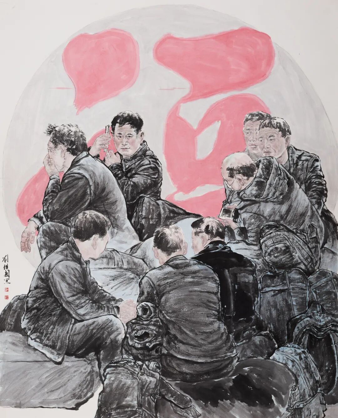 刘祖国的艺术魅力,在于他始终将“人”置于画面中心。他笔下的劳动者,没有概念化的符号标签,只有被汗水浸润的衣袖、被岁月雕刻的皱纹。他以毛笔为史笔,证明唯有俯身倾听大地的心跳,艺术才能获得永生之力。