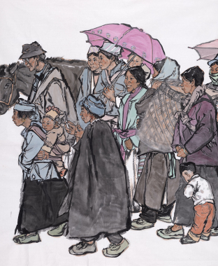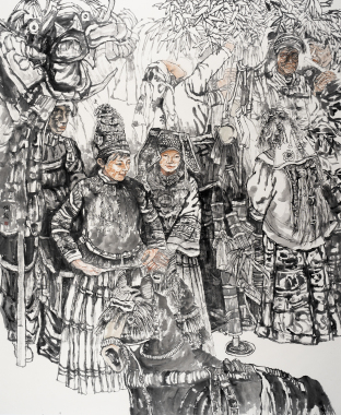 In recent years, the creation takes the western minorities as the material, and has been on-the-spot investigation and sketching for many times. The creation of his ink characters not only has the academic height of academic solid foundation, but also pays attention to reflect people's livelihood, it reflects some common scenery in real life, which is refreshing and can be appreciated by both refined and popular tastes. With pen and ink, the technique of landscape flower-and-bird painting can be freely used in his figure painting creation, which is quite popular among collectors.